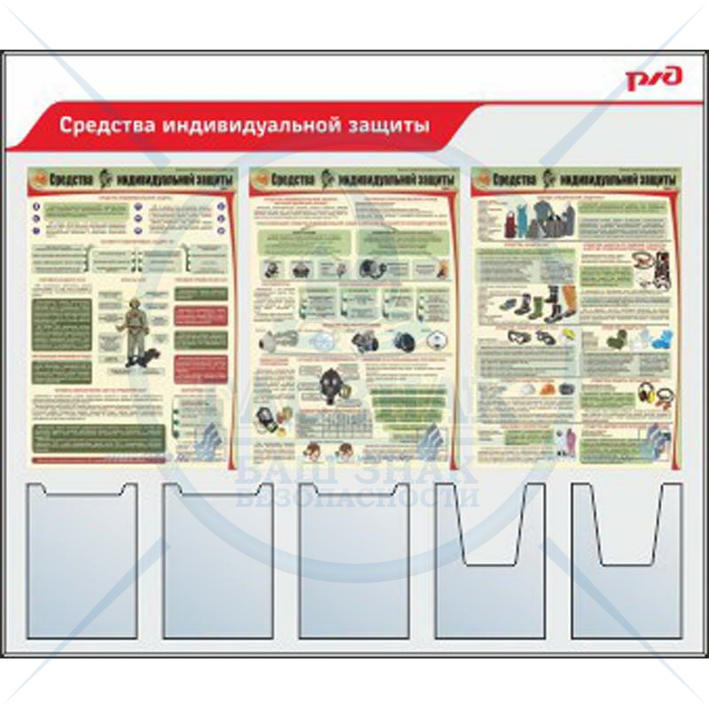 Стенды по охране труда для ОАО РЖД Средства индивидуальной защиты 3 плаката А2, 3 плоских кармана А4, 2 объемных кармана А4 (Пластик ПВХ 4 мм, алюминиевый профиль; 1400х1200)