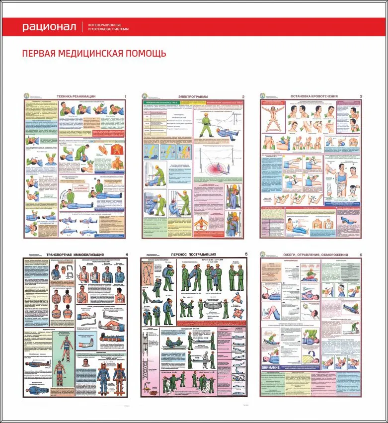 Стенды по охране труда Первая медицинская помощь 1200х1000 (пластик ПВХ 4 мм, 6 плакатов), логотип Газпром трансгаз (Пластик ПВХ 4 мм , пленка самоклеющаяся, алюминиевый профиль; )