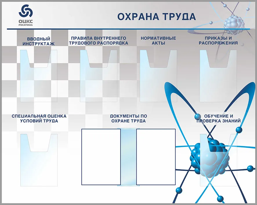 Стенд напольный Охрана труда Наполнение : 6 объемных карманов А4, перекидная система А4 на 10 рамок, все кармашки с подписями. Джокерная труба по периметру стендов, т-образные ножки. Логотип (1500х1200; Пластик ПВХ 4 мм, пластиковый профиль )